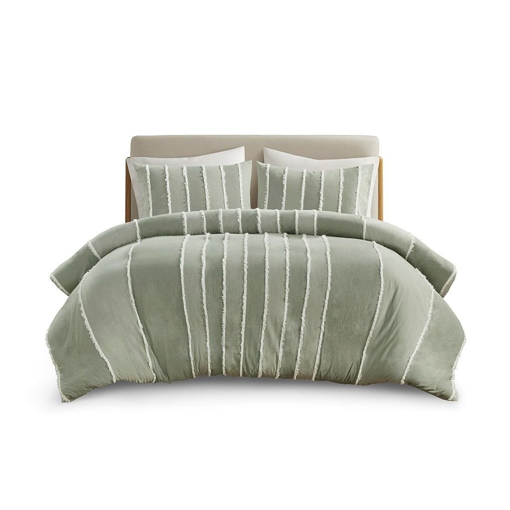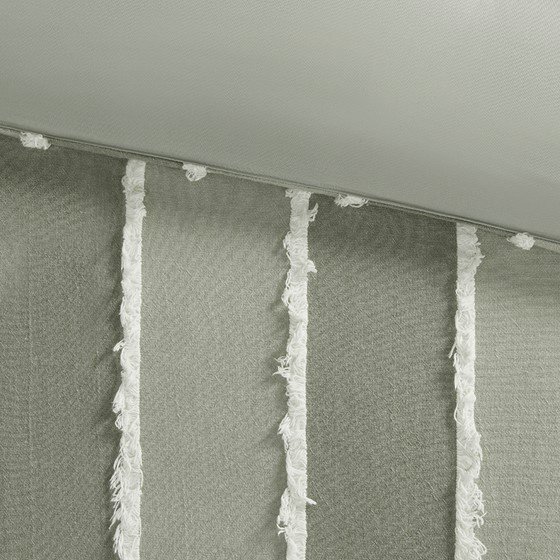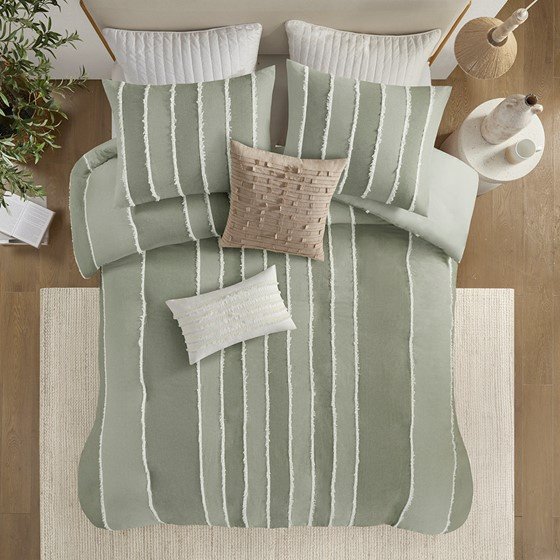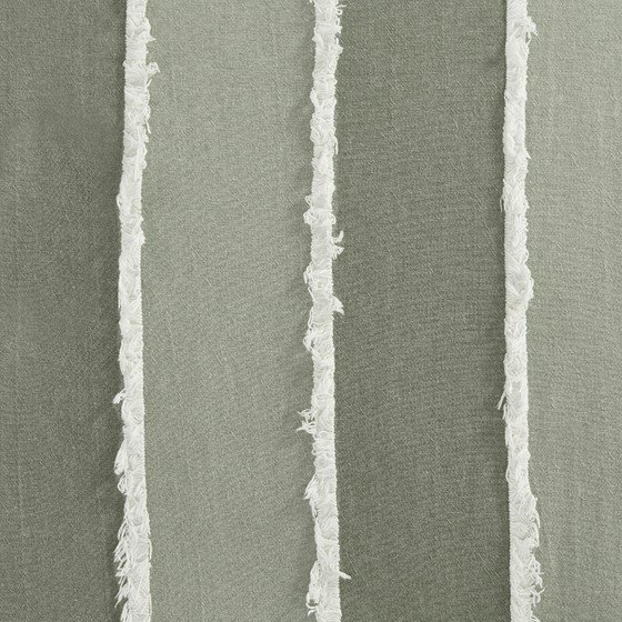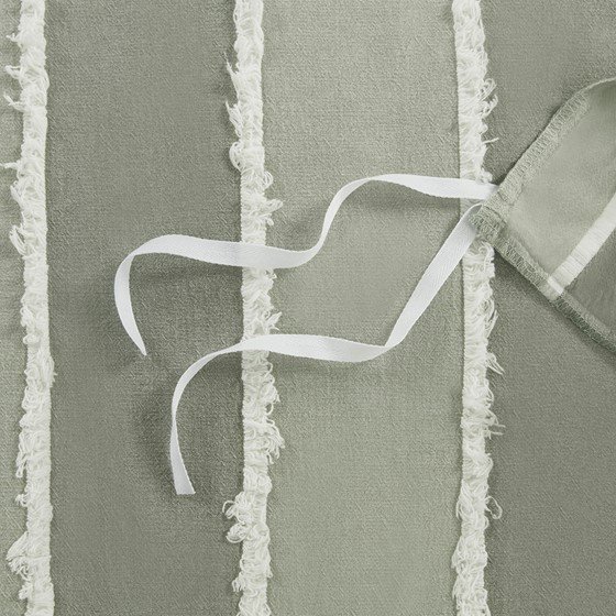Embrace the effortless charm of our boho-inspired bedding set. This collection includes 100% cotton duvet and 2 matching shams, each with an easy overlap closure. The standout feature is the alternating green stripes adorned by the clip jacquard trim in a contrasting white. The duvet includes four inner ties to keep your insert secure (insert not included) and features a button closure. Certified safe on skin by OEKO-TEX, this set is free of harmful substances, and environmentally friendly. And when it's time for a refresh, simply toss the set into the washing machine (check care label for detailed instructions). With our bohemian-inspired bedding, you can create a casual, relaxing look in your bedroom.