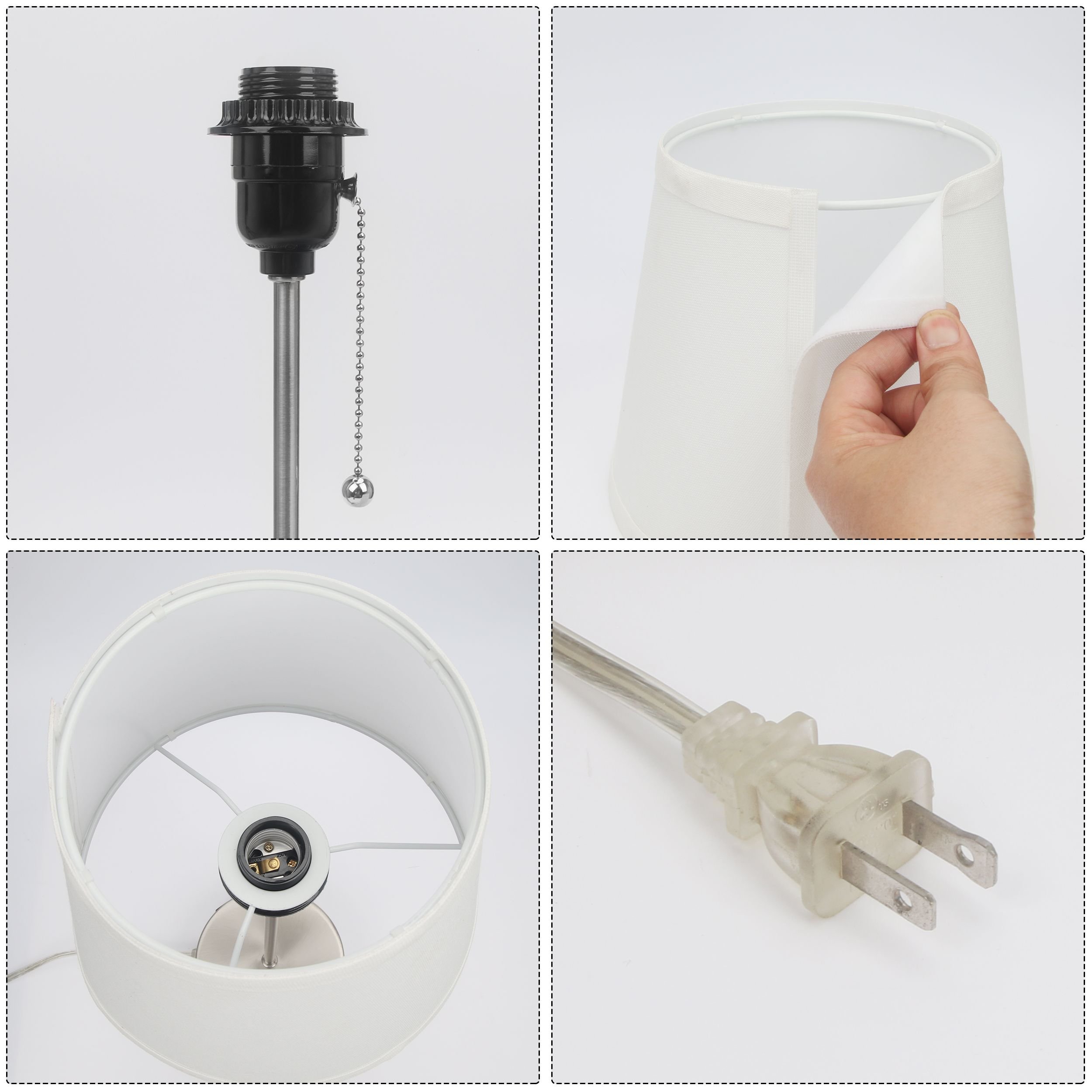This product features a brushed steel base and a white tapered drum fabric shade. It comes equipped with a USB seated in the base for use to charge mobile phone; tablet; kindle reader; and other small electronic devices. A 6W LED bulb is included; with a warm white glow nicely diffused from the lampshade; it will add brilliance to any room. A Pretty pull-chain switch is conveniently located from the lamp socket; and it is easy to turn on/off the light by your hand.