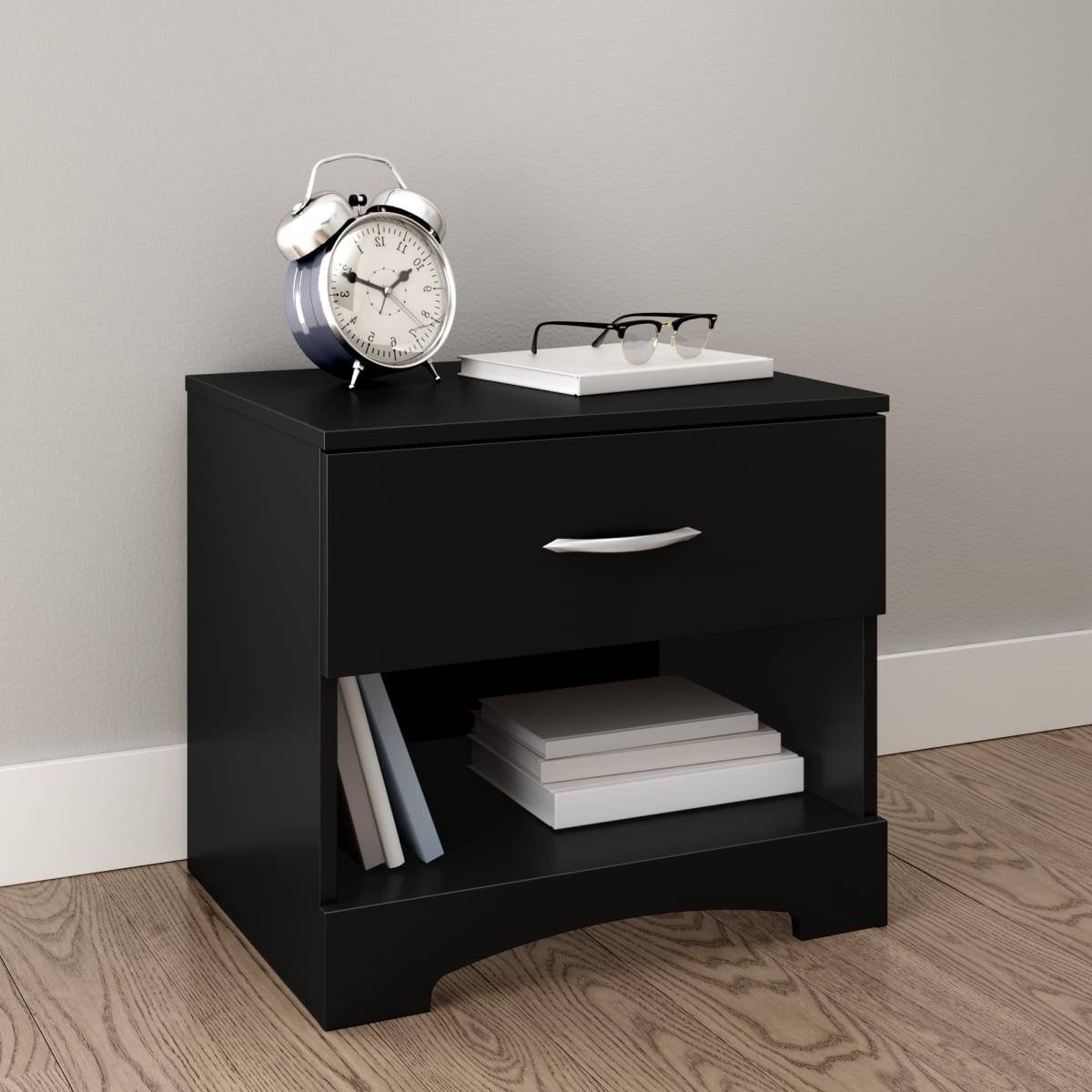 Need modern storage space? No problem!! This clean nightstand offers clean lines and a modern look that will complement any bedroom décor. Convenient Storage Featuring an open easy-access storage space ideal for bedside reading materials, the nightstand also includes a convenient and practical drawer with smooth metal drawer slides and a durable metal handle. This product is made in North America with Laminated particleboard. Accessories not included.