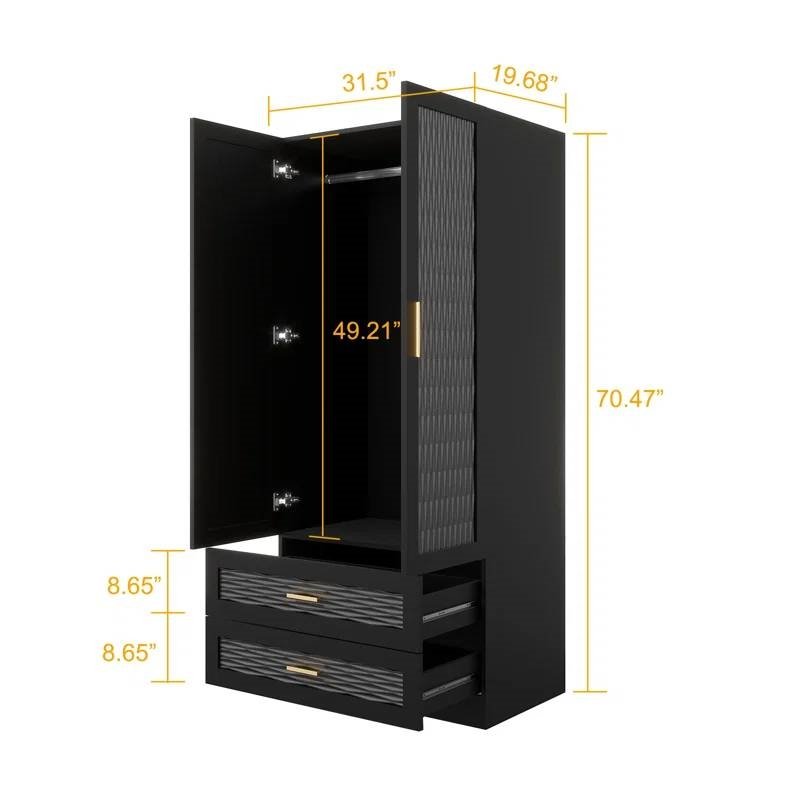 This Black Wardrobe Armoire Cabinet with Mirror Hanging Rod and Storage Drawers adopts a 2 door design, elegant and atmospheric, easy to integrate into your bedroom or checkroom to meet diversified storage needs. armoires and wardrobes is embedded with a full-length mirror, which not only saves extra space, but also makes it easy to check your daily outfits and adds brightness and a sense of openness to the room. Built-in a sturdy hanging rod and 2 drawers, suitable for hanging and folding long and short clothes, perfectly adapting to different storage needs. Every aspect of black armoire wardrobe closet has been meticulously designed, with rounded edges to prevent bumps and bruises, and a smooth surface that is easy to clean and maintain. Robust hinges ensure quiet and seamless door operation, elevating the overall user experience. More than just a garment sanctuary, this large wardrobe closet embodies a lifestyle choice. We provide complete installation instructions and Videos for all of our wardrobe cabinets, and all screws and parts are numbered. All pieces of the armoire wardrobe cabinet are clearly labeled. With detailed paper and video instruction, you won't get stuck with assembly.