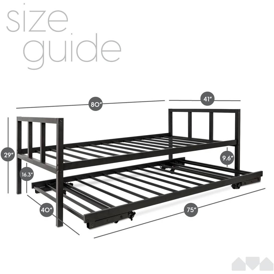 Our Twin Heavy Duty Black Metal Daybed Frame with Roll-Out Pop-Up Trundle Bed Frame is ideal for small living spaces and guest bedrooms. It two beds when you need them, perfect for sleepover guests and child slumber parties. Hate sleeping just inches off the floor? With its exclusive design, our trundle bed easily raises to full height by lifting the legs, so you can enjoy a truly comfortable night's sleep. Use the beds separately or arrange them side-by-side and top with a king-sized mattress for an instant king bed! With its sophisticated black metal frame and attached head and foot boards. Trundle bed can be wheeled in both high and low positions, and legs can be quickly and easily raised to reach the height of the daybed. Built from durable materials, our beds are made to last. Beds have a maximum weight limit of 350 lb. each and are 100% compliant with all US safety regulations. They feature locking wheels for added safety. Beds measure 75" long x 40" wide. Simple Assembly means your bed will be ready for use in no time at all. Bed and trundle accommodate two twin sized mattresses (NOT included), and trundle can fit a mattress up to 9.5" thick. Beds are ready to use as-is and no box spring required.