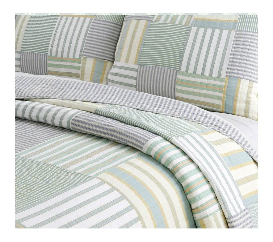 Create a beautiful tranquil welcoming place within your home with this King Size Soft Reversible Patches 100% Cotton Quilt Set. The balance of stripped patterns and calming colors tones are a perfect combination. A variety of horizontal and vertical stripped patterns in various shades of green, yellow, blue patchwork together in a square patchwork balance together. This cotton quilt set is reversible so that you can quickly and easily change the look of your room. Made completely of 100% Cotton. Easy-care machine-washable cotton material, this quilt set is easy and quick to launder.
