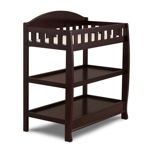 Modern Dark Brown Chocolate Finish Changing Table with Pad does it right by parents and babies with this incredibly versatile changing table! Featuring 2 fixed shelves for flexible storage, this sleek changer includes a water-resistant changing pad and a safety strap, plus security rails on all sides.