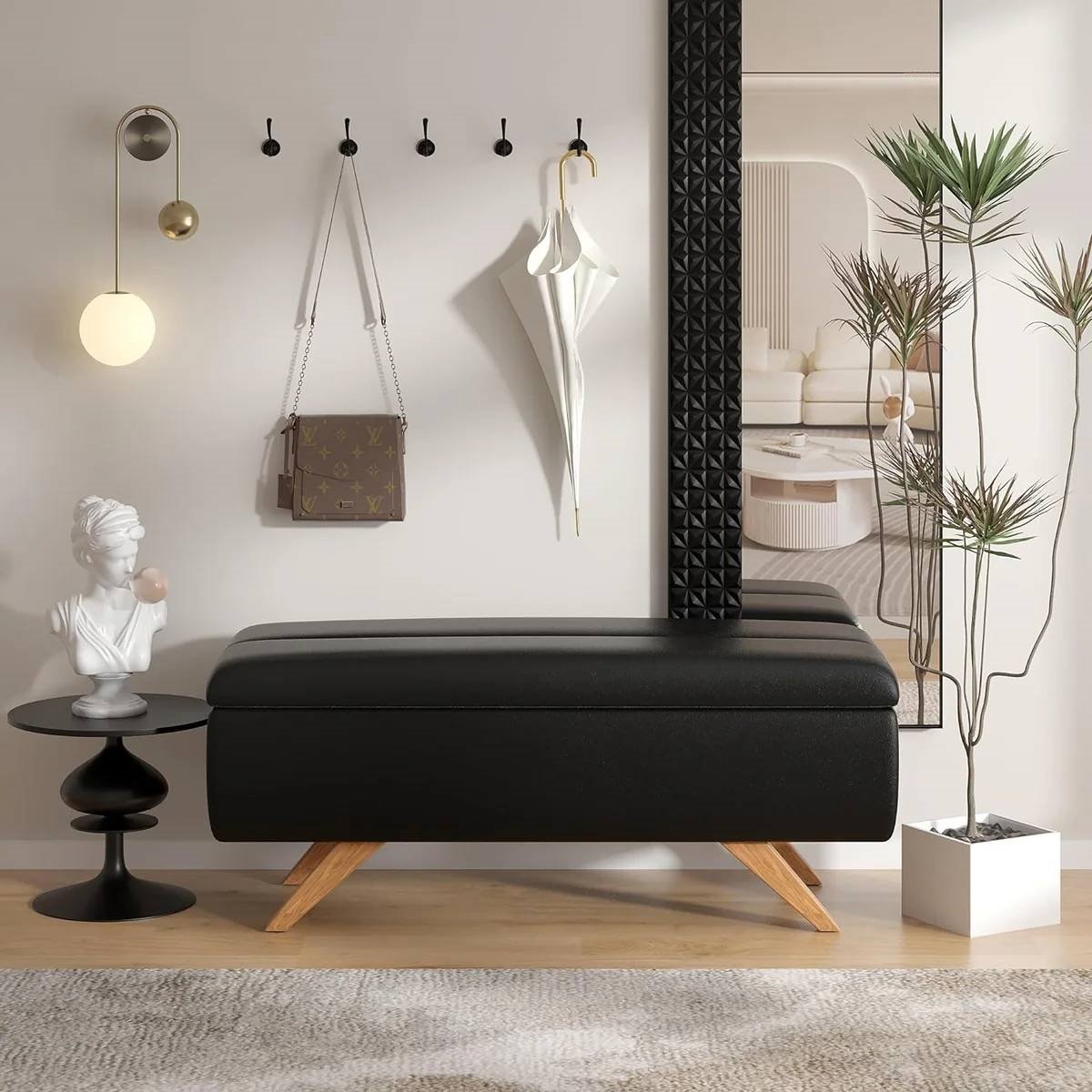 • Mid-Century Modern Black Faux Leather End of Bed Storage Bench Ottoman