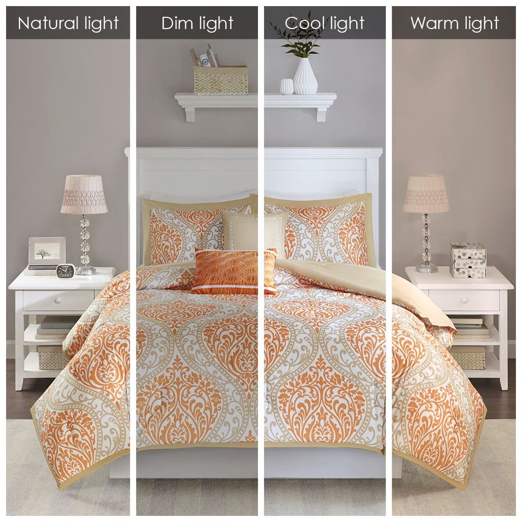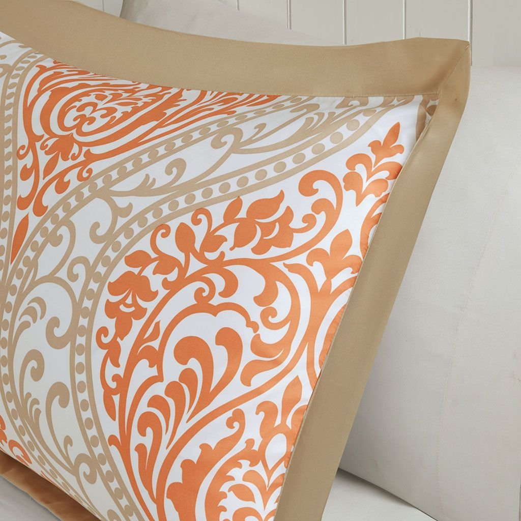 Make a statement in your bedroom with Intelligent Design's Senna Comforter Set. Flaunting a large damask print, this beautiful comforter creates a striking contrast with a gorgeous orange and taupe color palette. The matching shams (1 for Twin/TwinXL sizes) echoes the bold and stylish pattern seen on top of the bed, while a solid flange provides a finished touch. Machine washable for easy care, this chic comforter set is made from ultra-soft microfiber for long-lasting comfort and style. Coordinating decorative pillows feature intricately embroidered details to complete this captivating look. This bedding set uses an antimicrobial treatment that provides built-in freshness protection, reducing the growth of odor causing bacteria to keep fabric lasting longer.